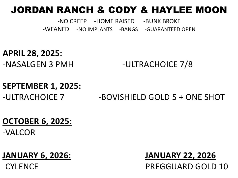 93 BLK/BWF HEIFERS, BV, 56 BLK/BWF HEIFERS @ 720 LBS, 37 BLK/BWF HEIFERS @ 650 LBS, NI, HR, CVP + BOOSTER, PREGGUARD SHOT, POURED, JORDAN RANCH & CODY & HAYLEE MOON