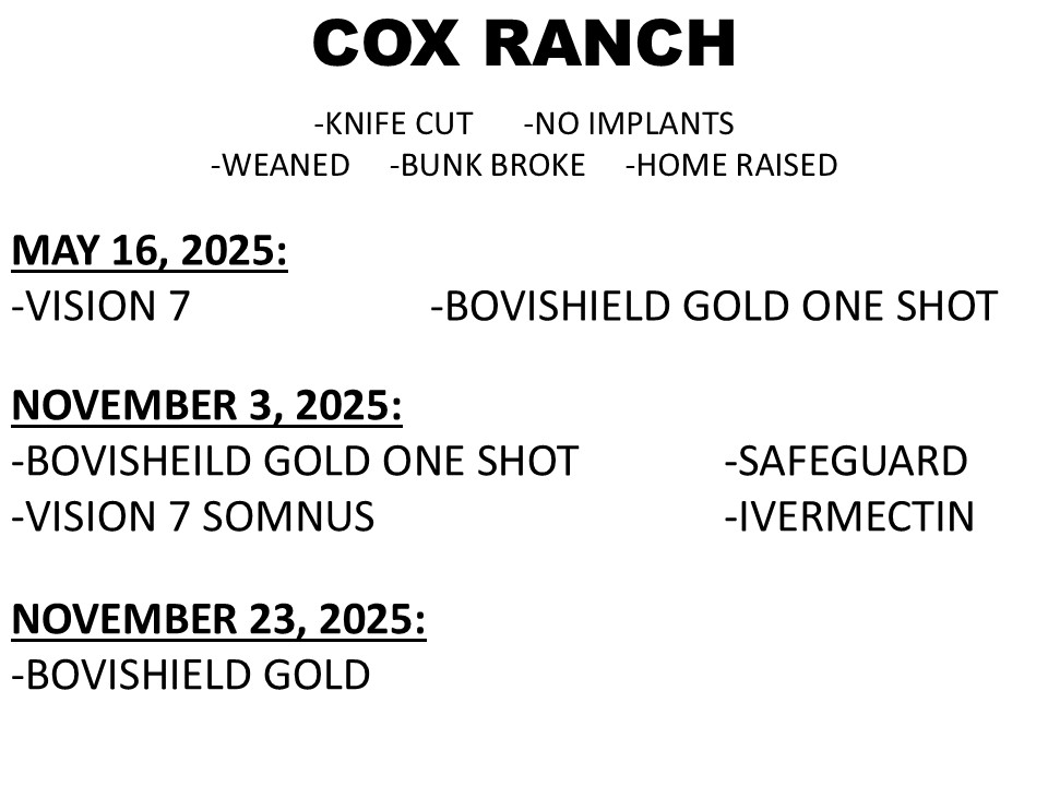 155 BLK ANGUS STEERS & HEIFERS, (STRS: 750-825 LBS & HFRS: 525-600 LBS), HR, CVP, POURED, LONG TIME WEANED COX RANCH